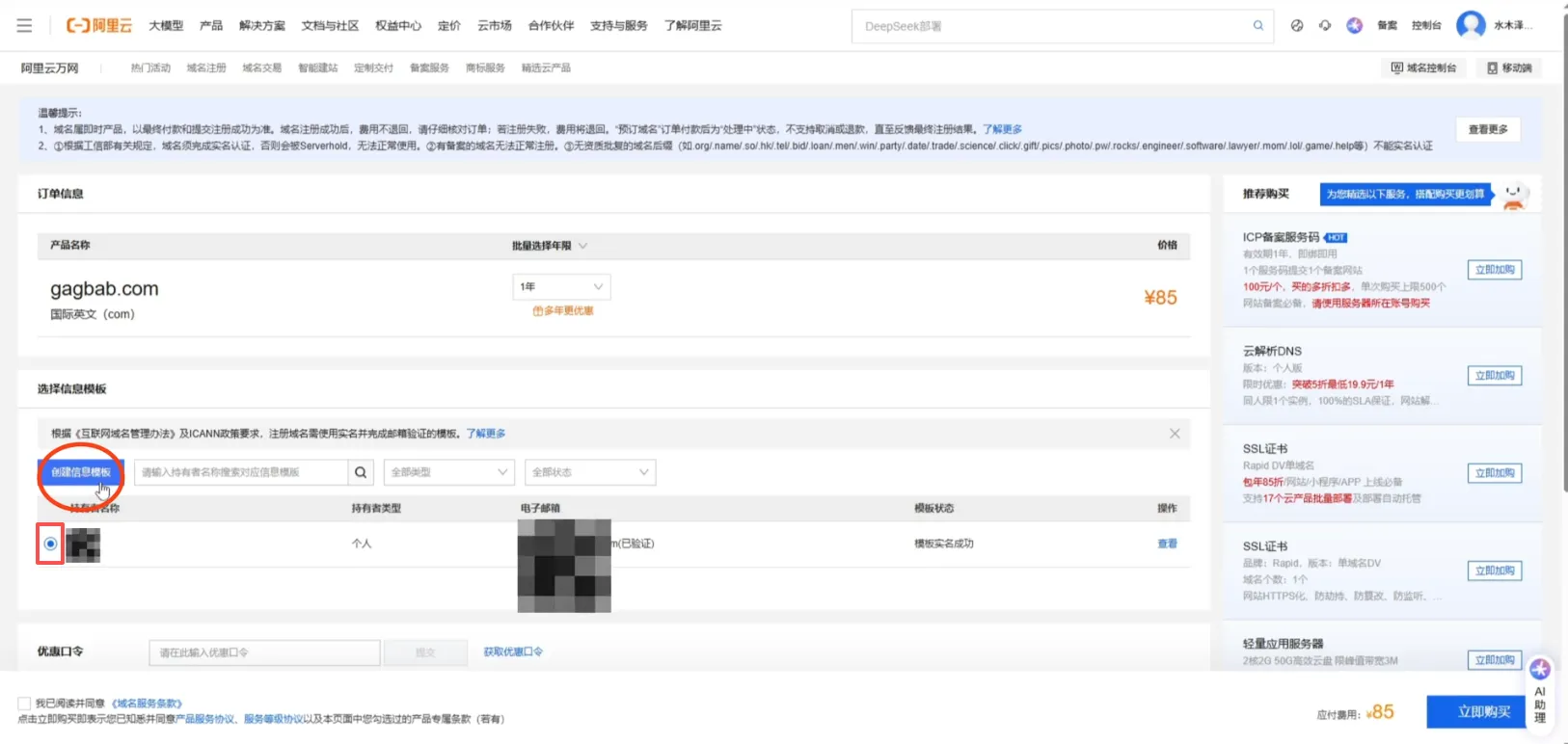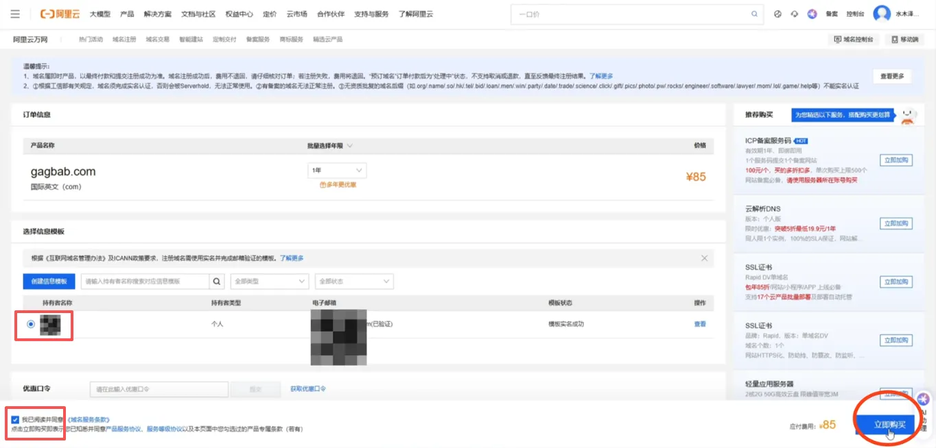 创建好模板后,我们选择刚刚创建好的模板,勾选同意条款,点击“立即购买”