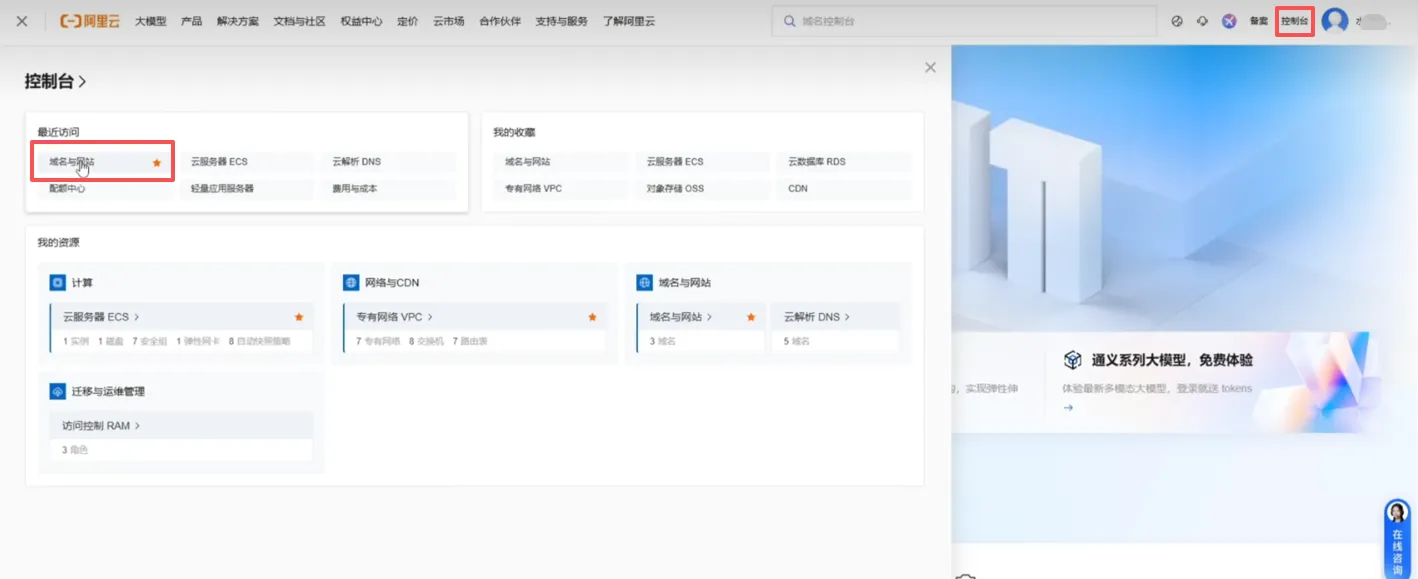 然后我们回到阿里云首页,点击“控制台” – “域名与网站” – “全部域名”