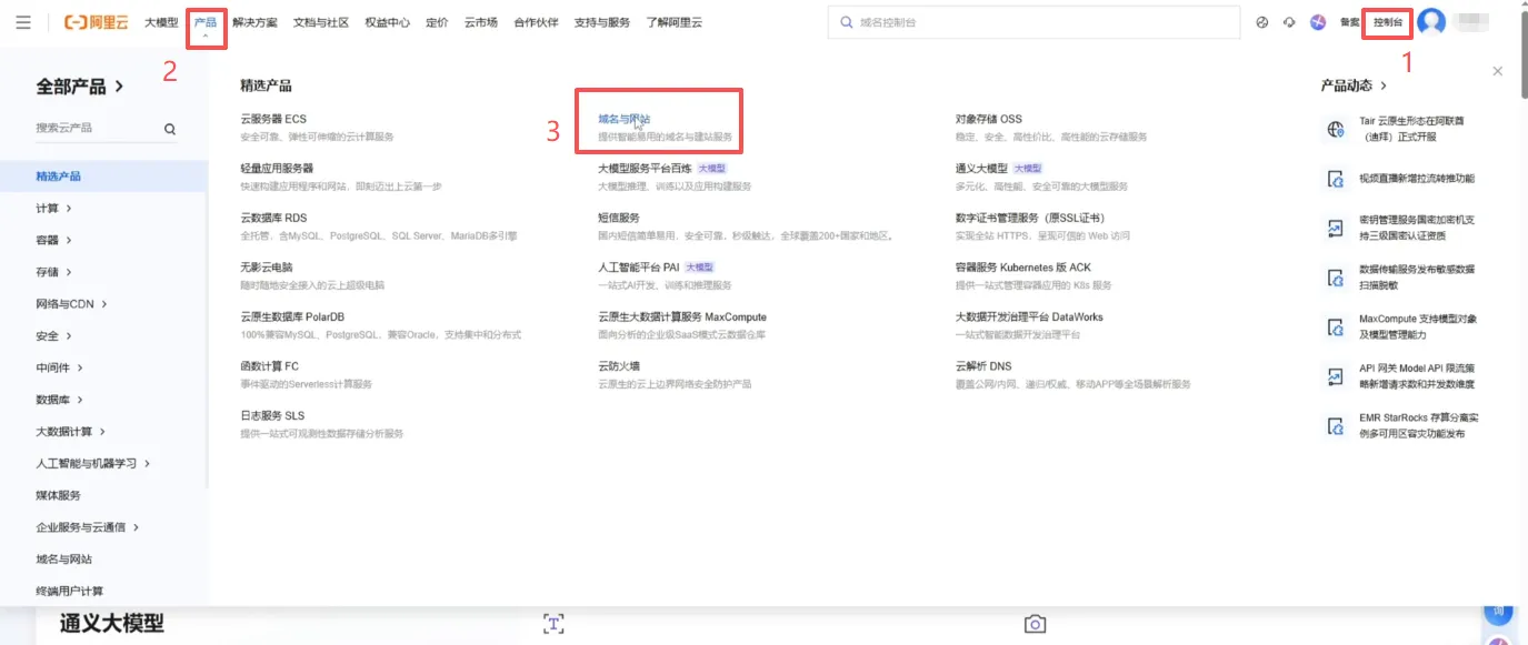 我们回到首页,选择“产品” – “域名与网站”,