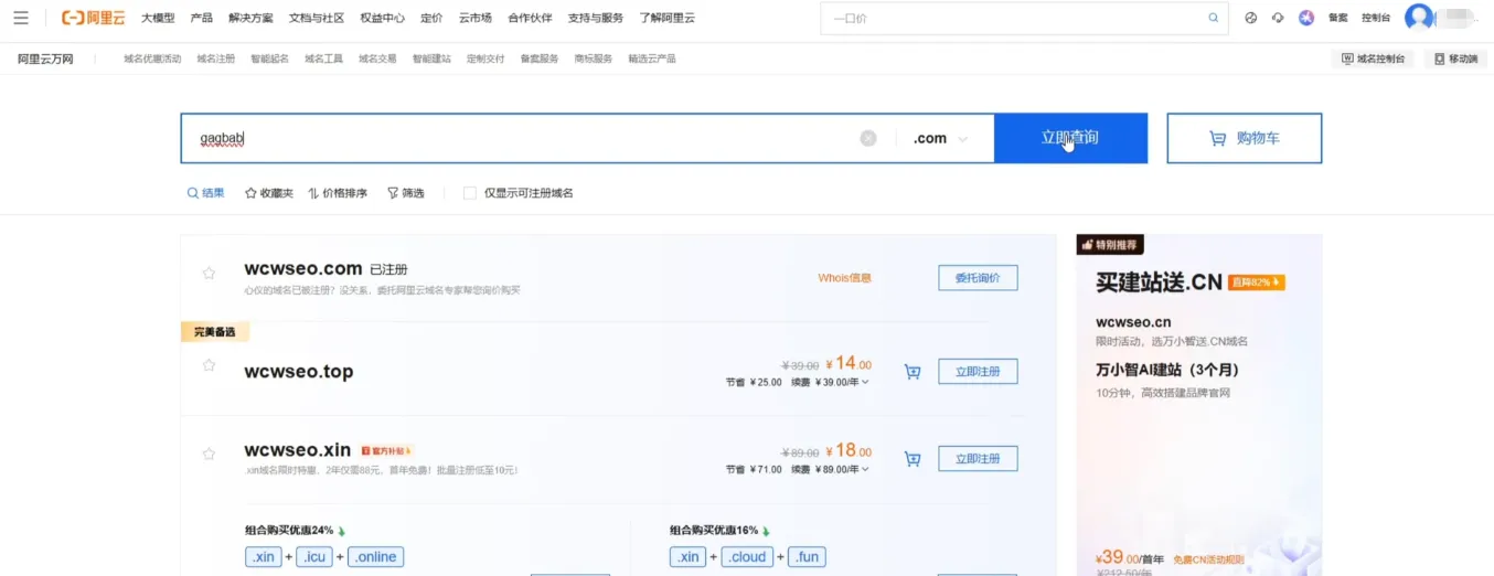 在这里我们输入我们想要注册的域名,比如我想注册wcwseo.com,输入后我们点击“查询域名”,就会跳出以下页面。
