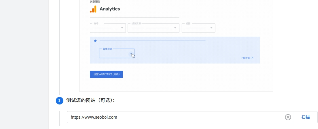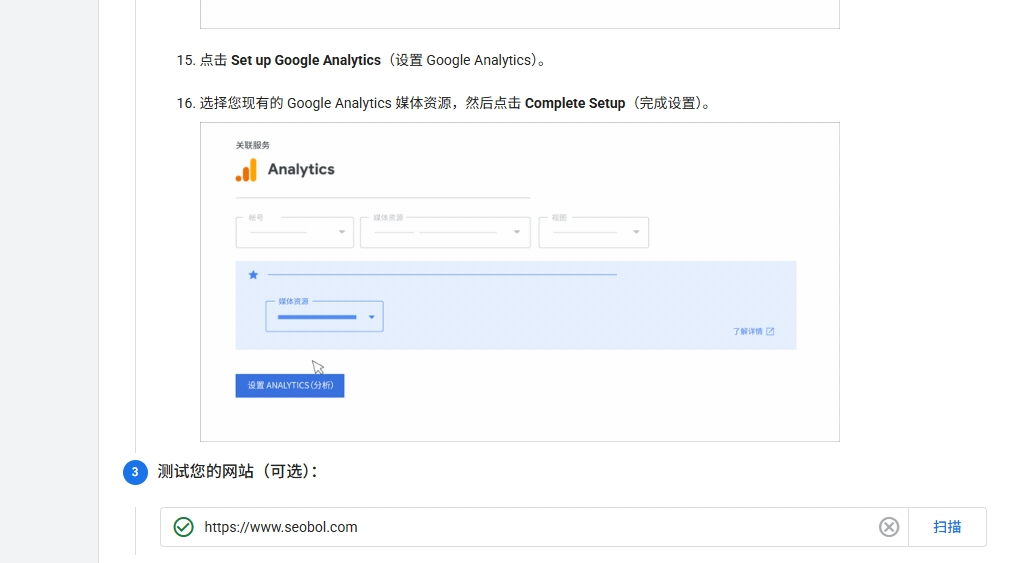 4.最后一步,返回google analytics,点击扫描网址,显示绿色打勾,说明关联成功。