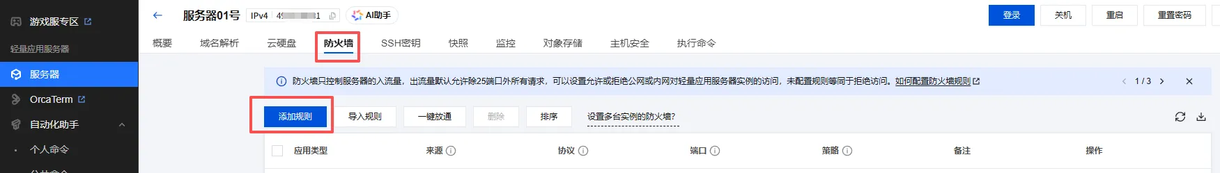 我们回到腾讯云服务器的界面,选择 防火墙 – 添加规则