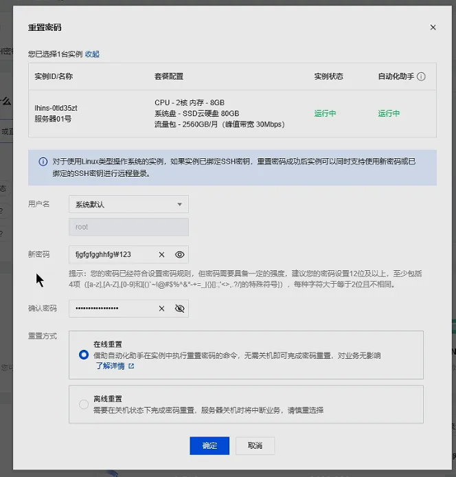 如果我们之前购买服务器时,配置服务器的时候,有自定义密码,那么这一步可以省略。没有的话,也没关系,点击上图中的“重置密码”,进入重置页面。