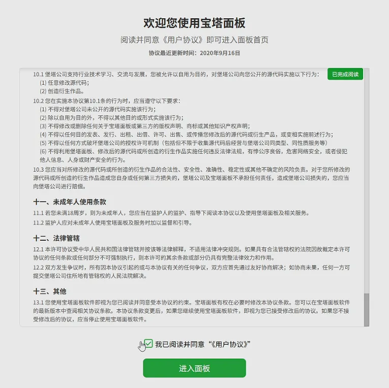 出现条款页面,下拉右方阅读进度条,打勾同意《用户协议》,点击“进入面板”。