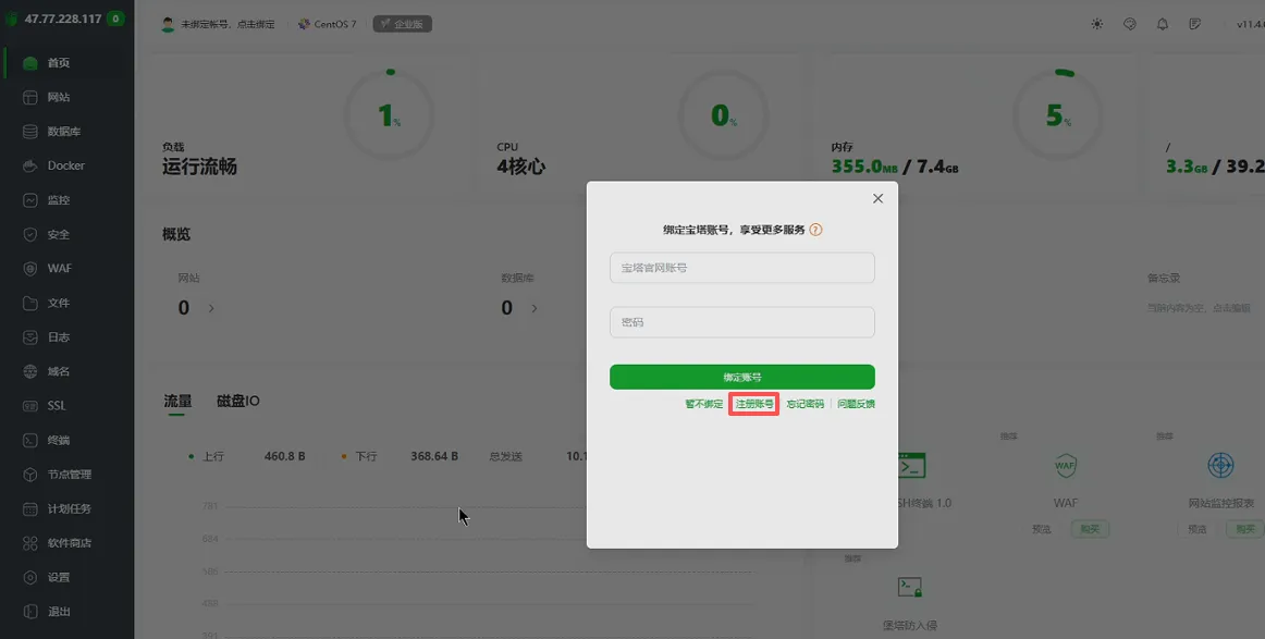 进入宝塔面板,新用户会弹出登陆宝塔账号页面,我们点击“注册账号”。