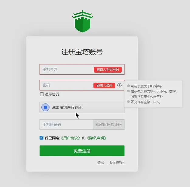 跳转到注册页面,我们简单用手机号码+验证码,设置登陆密码,注册宝塔账号即可,过程简单,不再详细讲。
