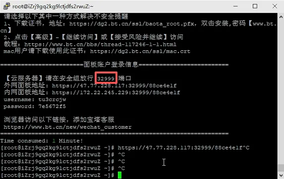 显示这个界面,表示安装已经完成,但是还不能登录,我们要先设置安全组放行红框显示的端口32999,下面介绍腾讯云设置步骤。
