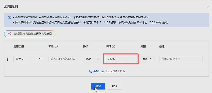 在“端口”这里输入32999,点击“确认”提交即可。