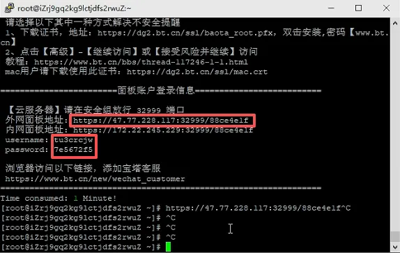 如上图所示,复制红框的宝塔面板的登陆链接,还有下面的用户名和登陆密码,粘贴到记事本备用。