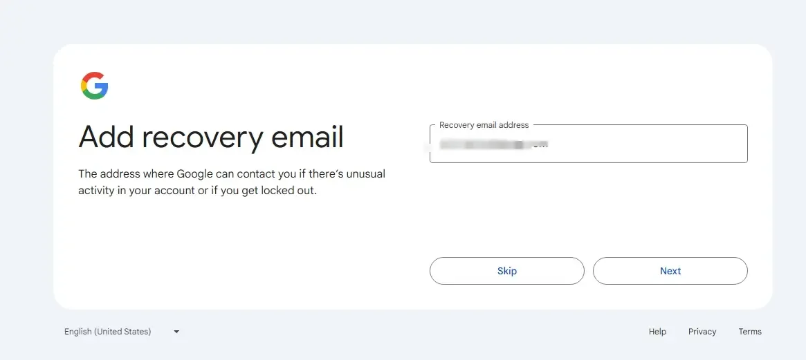 然后填写一个恢复邮箱,最好是你自己的常用邮箱,如果Gmail被封或者其他特殊情况,谷歌会通过这个恢复邮箱联系你。