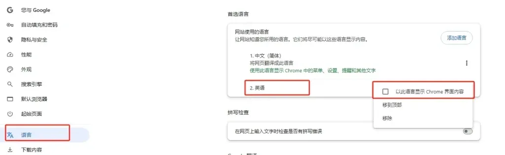 设置谷歌浏览器语言为英语,勾选“以此语言显示Chrome界面内容”。